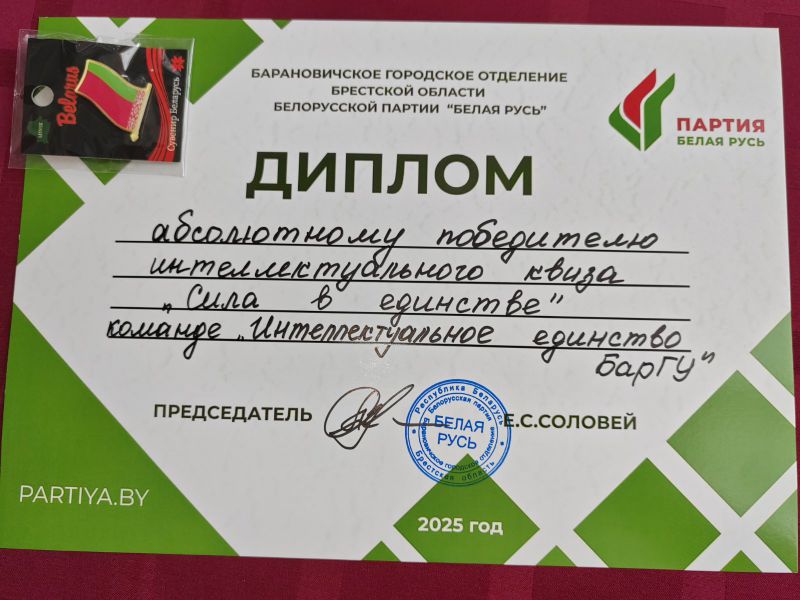 Выкладыкі кафедры АПДУ (Дземідовіч А. В., Рутман Е.Я.) у складзе універсітэцкай каманды “Інтэлектуальнае адзінства БарГУ” (капітан І. С. Булыга., Ж. В. Косціна) прынялі ўдзел у гарадскім інтэлектуальным квізе “Сіла ў адзінстве, прысвечанаму да Дня народнага адзінства” на базе гарадского дома культуры г. Баранавічы. Арганізатарам гэтага ідэалагічнага мерапрыемства выступілі Баранавіцкае гарадское аддзяленне Брэсцкай вобласці Беларускай партыі “Белая Русь” і аддзел ідэалагічнай працы і па справам моладзі Баранавіцакага ГВК. Каманда “Інтэлектуальнае адзінства БарГУ” годна выступіла ў гэтым мерапрыемстве стаўжы пераможцам сярод 10 каманд, прадстаўленых навучальнымі ўстановамі, прадпрыемствамі і арганізацыямі нашага горада.